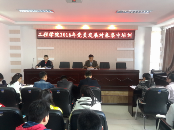 為深入貫徹落實《中國共產(chǎn)黨發(fā)展黨員工作細則》,進一步加強對黨員發(fā)展對象的教育培養(yǎng),切實提高黨員發(fā)展質(zhì)量,工程學院黨委于4月20在工程學院大會議室對2016年黨員發(fā)展對象進行集中培訓,學院黨委副書記王艷超、輔導員楊龍出席了此次培訓。