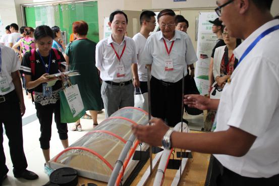 21日,大賽進(jìn)行作品展覽、現(xiàn)場答辯兩個環(huán)節(jié),我院參賽隊員用自己所學(xué)專業(yè)知識和在模型制作方面的創(chuàng)新之處為各位評委老師講解參賽作品。中國工程院院士羅錫文教授與教育部高等學(xué)校農(nóng)業(yè)工程教學(xué)指導(dǎo)委員會副主任、中國農(nóng)業(yè)工程學(xué)會副理事長張全國教授特別關(guān)注了我校研究生組《灌漿鋼管加固的桁架拱塑料大棚骨架》參賽作品,給予了好評和鼓勵。華南農(nóng)業(yè)大學(xué)副校長蔣恩臣教授對我校參賽作品《寒區(qū)自然通風(fēng)奶牛舍通風(fēng)裝置設(shè)計》具有濃厚的興趣,與參賽同學(xué)進(jìn)行了深入交談。