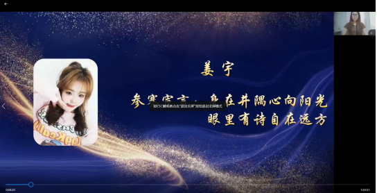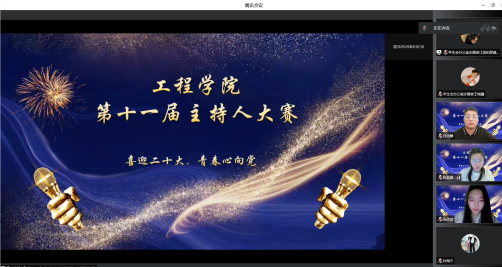 為迎接黨的二十大勝利召開,展示大學(xué)生積極向上和奮發(fā)有為的精神面貌,讓青春與祖國的脈搏共振,工程學(xué)院于924日線上舉辦了喜迎二十大,青春心向黨第十一屆主持人大賽決賽。學(xué)院黨委副書記孫海寧、輔導(dǎo)員王小婷老師、陳盈霖老師、孫浩老師、孫浩楠老師、邢伯文老師、張欣欣老師擔(dān)任評委, 200名同學(xué)參加了此次活動。經(jīng)過初賽、復(fù)賽,最終9名選手脫穎而出進(jìn)入總決賽。本次比賽總共分為四個環(huán)節(jié)。第一環(huán)節(jié)為選手自我介紹,第二環(huán)節(jié)為紅色故事會,第三環(huán)節(jié)為影視配音秀,第四環(huán)節(jié)為黨的頌詩。