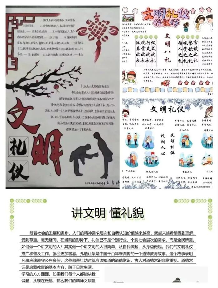文明禮儀寫(xiě)在手抄報(bào)中,說(shuō)在口中,記在心中。本次活動(dòng)給同學(xué)們上了一堂深刻的文明禮儀課,手抄報(bào)的內(nèi)容包括生活禮儀、交往禮儀、公共場(chǎng)所禮儀和學(xué)習(xí)禮儀,同學(xué)們充分利用課余時(shí)間搜集資料、動(dòng)手設(shè)計(jì)、制作手抄報(bào),作品有的宣傳文明禮儀常識(shí),有的宣傳好人好事,有的宣傳禮儀名言警句……一幅幅主題鮮明、設(shè)計(jì)新穎、版面精美的手抄報(bào)令人眼前一亮。