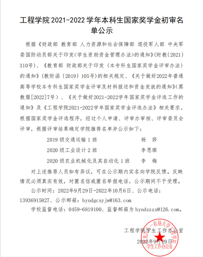 工程學(xué)院 2021-2022 學(xué)年本科生國家獎(jiǎng)學(xué)金初審名單公示