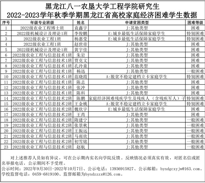黑龍江八一農(nóng)墾大學(xué)工程學(xué)院研究生2022-2023學(xué)年秋季學(xué)期黑龍江省高校家庭經(jīng)濟(jì)困難學(xué)生數(shù)據(jù)