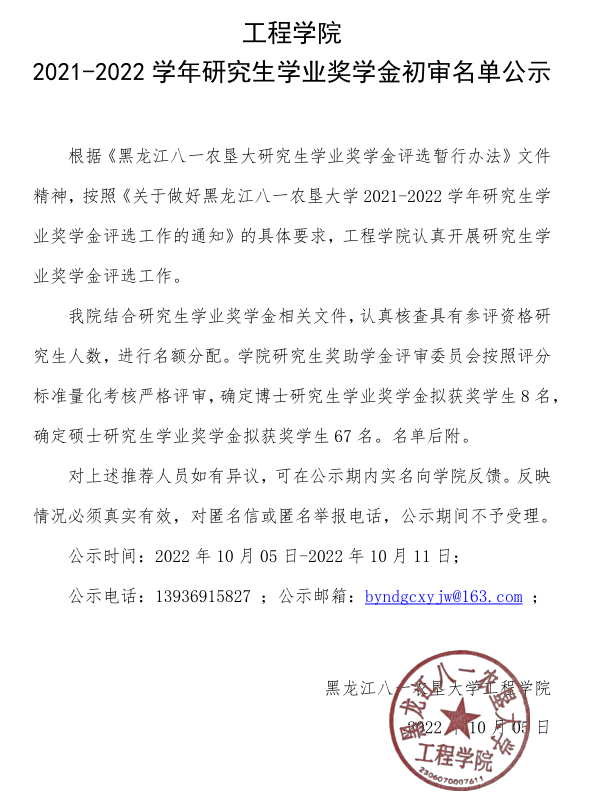 學院2021-2022 學年研究生學業(yè)獎學金初審名單公示