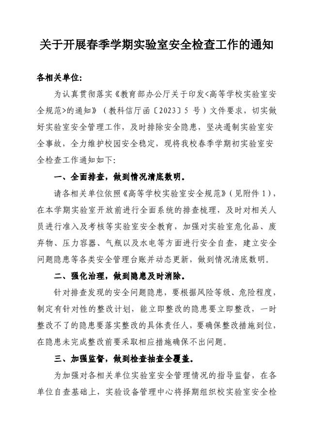 關(guān)于開(kāi)展春季學(xué)期實(shí)驗(yàn)室安全檢查工作的通知
