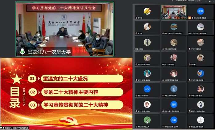 12月6日,校長鄭喜群為學院黨委、機關黨委財務處黨支部作題為《深入學習貫徹黨的二十大精神,加快建設特色鮮明高水平現(xiàn)代農業(yè)大學》的黨的二十大精神主題宣講,會議采取線上線下相結合的方式進行。機關黨委財務處黨支部全體黨員、我院黨委理論學習中心組成員、黨支部書記、青馬班學員以及學院全體教職工和學生黨員參加學習。學院黨委書記宋清萍主持學習會。