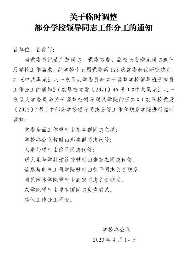 關(guān)于臨時(shí)調(diào)整部分學(xué)校領(lǐng)導(dǎo)同志工作分工的通知