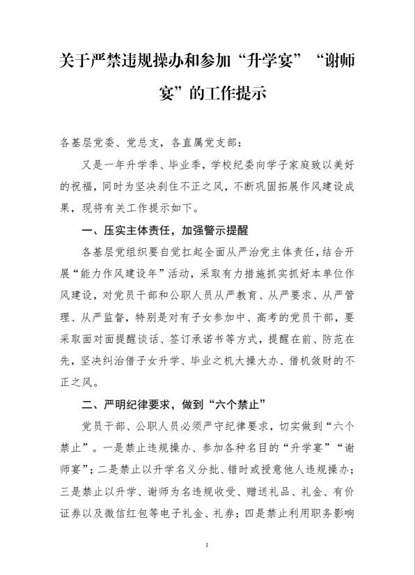 關(guān)于嚴(yán)禁違規(guī)操辦和參加“升學(xué)宴”“謝師宴”的工作提示