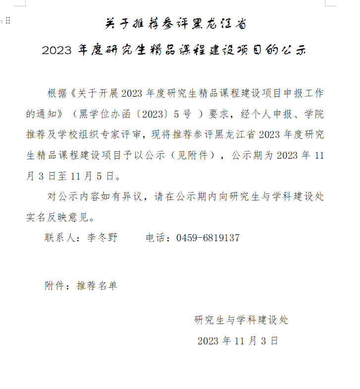 關(guān)于推薦參評(píng)黑龍江省2023年度研究生精品課程建設(shè)項(xiàng)目的公示