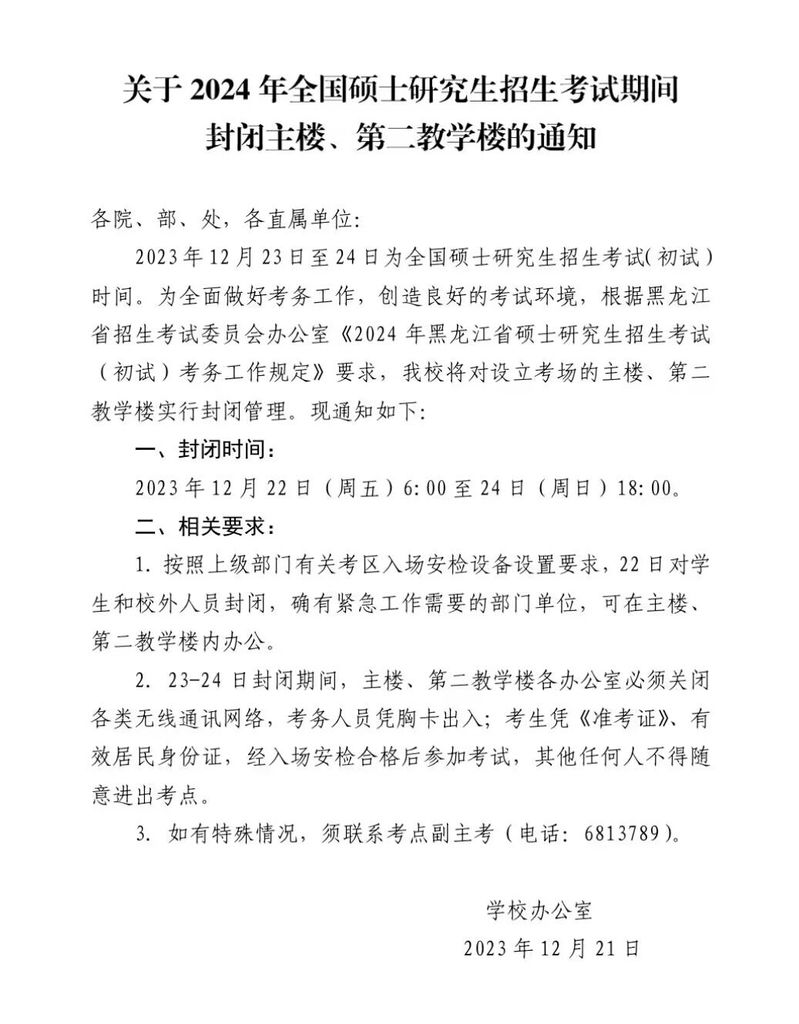 關于2024年全國碩士研究生招生考試期間封閉主樓、第二教學樓的通知