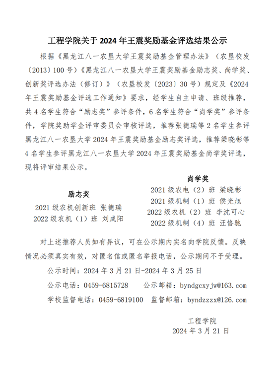 學院關于2024年本科生王震獎勵基金評選結果公示