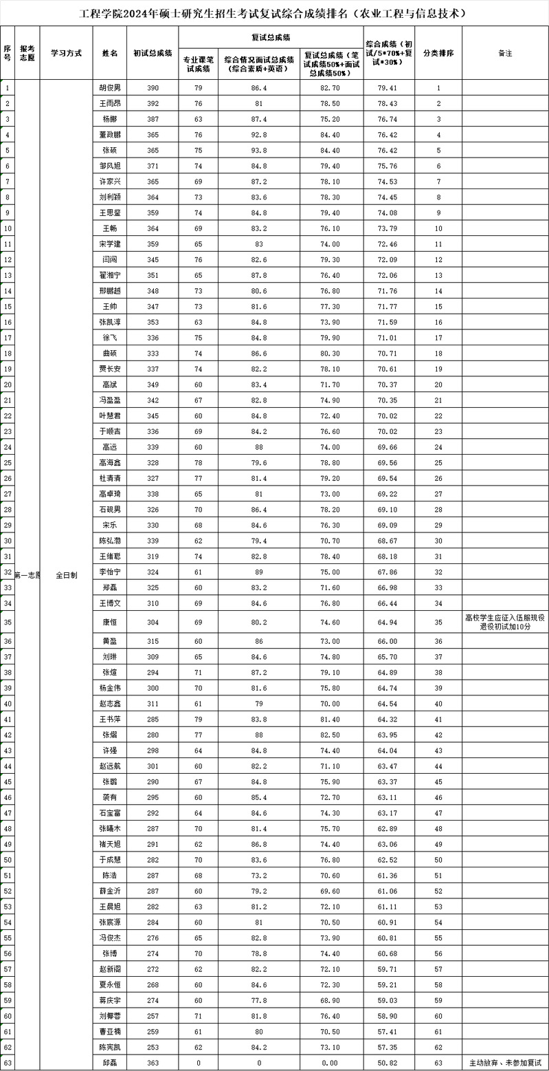 按照黑龍江八一農(nóng)墾大學(xué)2024年碩士研究生招生考試復(fù)試及錄取辦法,經(jīng)復(fù)試(專業(yè)課復(fù)試和綜合情況面試),結(jié)合初試成績,現(xiàn)將工程學(xué)院2024年一志愿碩士研究生招生考試綜合成績公示如下。如有異議,請在公示期(2024年4月3日-4月8日)內(nèi)反饋,聯(lián)系電話0459-6819214、6819220。