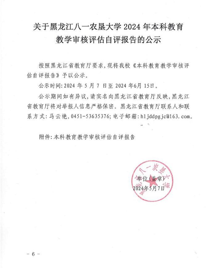 關(guān)于黑龍江八一農(nóng)墾大學(xué)2024年本科教育教學(xué)審核評估自評報告的公示