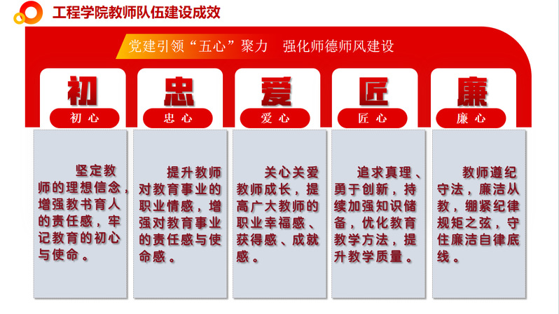 工程學(xué)院秉承“強教必先強師”理念,在師德師風(fēng)建設(shè)工作中充分發(fā)揮黨建引領(lǐng)作用,聚焦“五心”建設(shè),強化教師隊伍師德師風(fēng)建設(shè),努力打造一支信念堅定、師德高尚、業(yè)務(wù)精湛、作風(fēng)優(yōu)良、育人成效顯著、結(jié)構(gòu)合理的高素質(zhì)專業(yè)化教師隊伍。