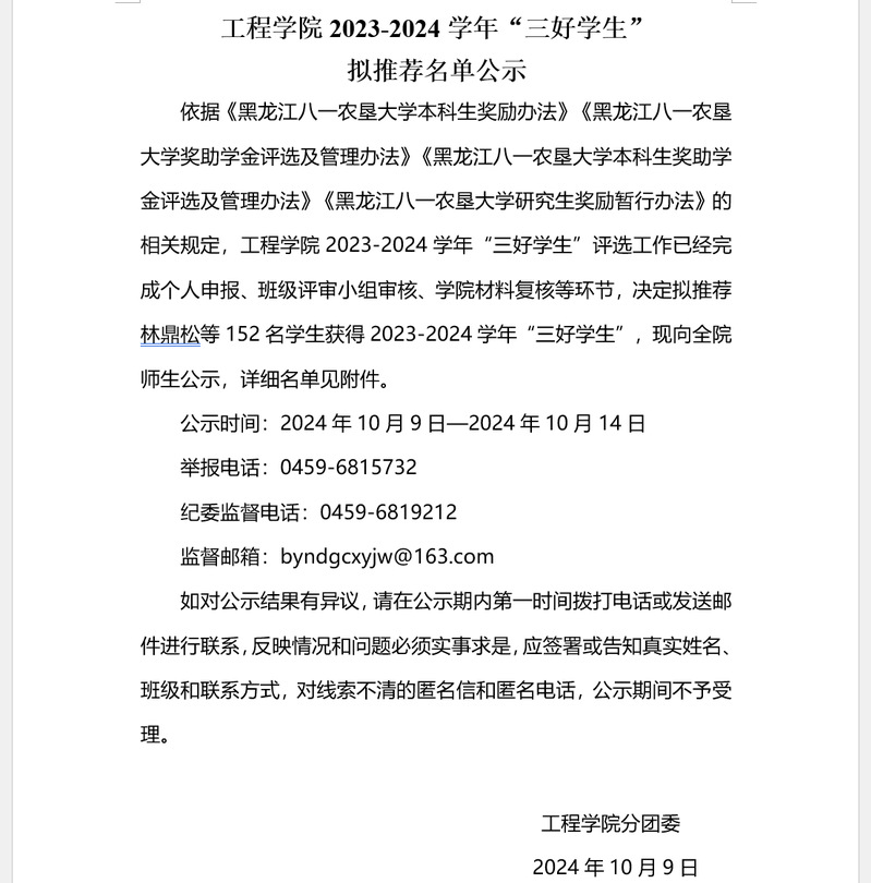 工程學(xué)院2023-2024學(xué)年“三好學(xué)生”擬推薦名單公示