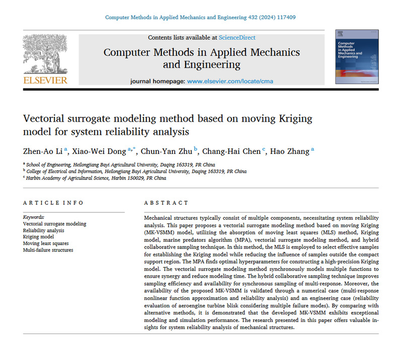近日,計(jì)算力學(xué)頂級(jí)期刊《Computer Methods in Applied Mechanics and Engineering》(簡(jiǎn)稱CMAME,中科院一區(qū)TOP,IF:6.9)在線發(fā)表了題為Vectorial surrogate modeling method based on moving Kriging model for system reliability analysis的研究成果。碩士研究生李振澳為論文第一作者,論文通訊作者為董曉威教授。