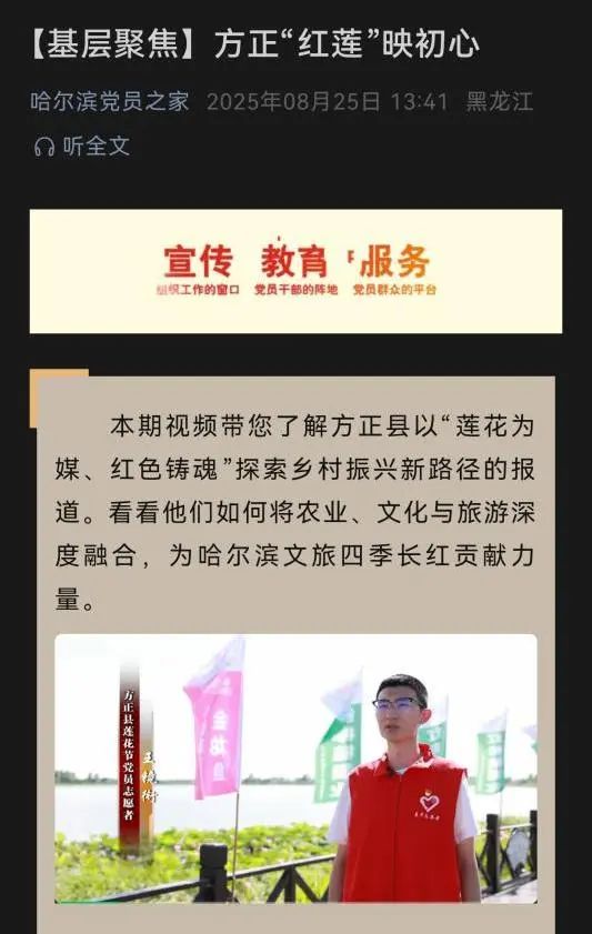 實(shí)習(xí)期間,王鏡銜主動(dòng)扛起志愿服務(wù)重任,成為方正縣重大活動(dòng)保障的“青春守護(hù)者”。在全民運(yùn)動(dòng)會(huì)中,他全程參與賽事引導(dǎo)、秩序維護(hù)與物資分發(fā),從晨光初綻到夜色降臨,始終堅(jiān)守崗位、耐心細(xì)致;在方正蓮花節(jié)期間,他全力做好游客接待工作,確保活動(dòng)各環(huán)節(jié)順暢推進(jìn),以熱情服務(wù)贏得參與者好評(píng)。