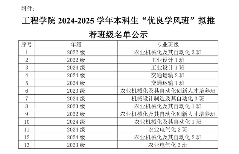 依據(jù)《黑龍江八一農(nóng)墾大學(xué)本科生獎(jiǎng)勵(lì)規(guī)定》《黑龍江八一農(nóng)墾大學(xué)獎(jiǎng)助學(xué)金評(píng)選及管理辦法》,工程學(xué)院2024-2025學(xué)年本科生“優(yōu)良學(xué)風(fēng)班”評(píng)選工作已經(jīng)完成班級(jí)申報(bào)、學(xué)院評(píng)獎(jiǎng)評(píng)優(yōu)領(lǐng)導(dǎo)小組評(píng)審等環(huán)節(jié),決定擬推薦2022級(jí)農(nóng)業(yè)機(jī)械化及其自動(dòng)化3班等13名個(gè)班級(jí)獲得2024-2025學(xué)年本科生“優(yōu)良學(xué)風(fēng)班”,現(xiàn)向全院師生公示,詳細(xì)名單見附件。