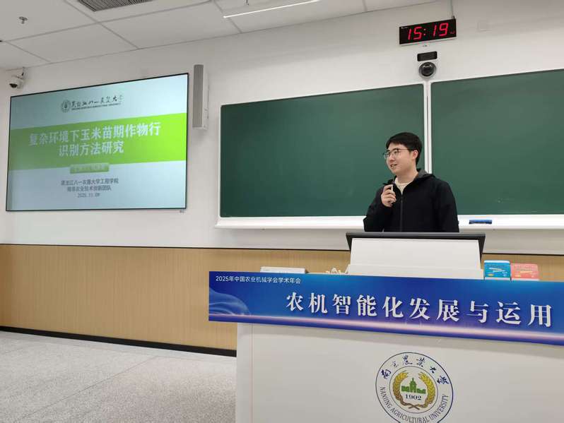 學(xué)院多位教師在專題分會場作報告。宋江和鞏海亮在農(nóng)機(jī)智能化發(fā)展與運用分會場做《平貝母機(jī)械化采收裝備研制及其相關(guān)理論研究》和《復(fù)雜環(huán)境下玉米苗期作物行識別方法研究》報告。王福成在智慧植保及“低空農(nóng)業(yè)”應(yīng)用技術(shù)與裝備分論壇做《低空經(jīng)濟(jì)中的人才培養(yǎng)與法規(guī)政策淺析》的報告。張東明在高效智能收獲減損技術(shù)與裝備分論壇做《谷子聯(lián)合收獲機(jī)分層清選技術(shù)與裝備研究》的報告。莊衛(wèi)東教授主持了農(nóng)機(jī)智能化發(fā)展與運用分會場。