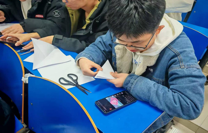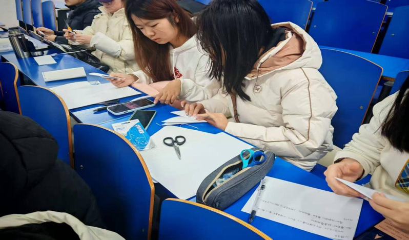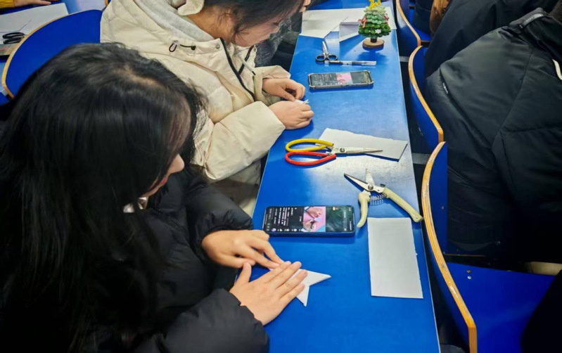 活動現(xiàn)場氛圍熱烈而溫馨,參加活動的同學提前準備了紙張、剪刀等工具,在工作人員的圖文講解下,深入了解了剪紙的基本技巧、雪花圖案的設計要點以及非遺剪紙的文化淵源。在創(chuàng)作過程中,大家既體驗了動手實踐的樂趣,又在協(xié)作交流中拉近了彼此距離,部分同學主動幫助操作不熟練的伙伴,耐心指導裁剪技巧。一張張精致的雪花剪紙不僅是傳統(tǒng)藝術與創(chuàng)意靈感的結合,更承載著同學們對美好事物的向往,傳遞著團結協(xié)作的正能量。