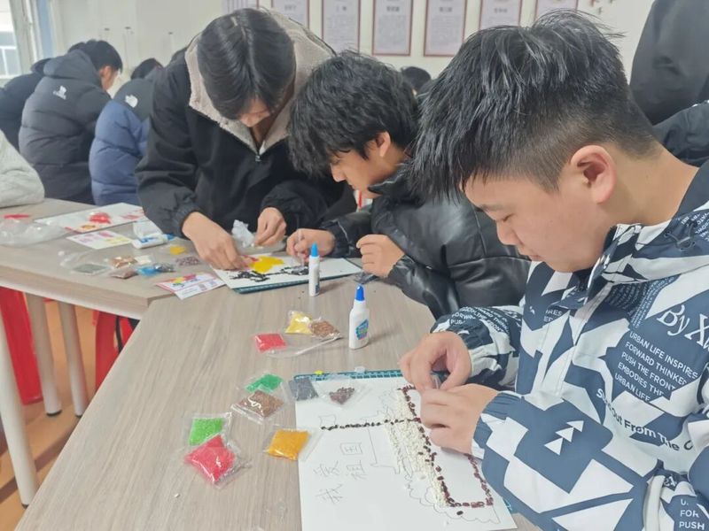 觀影結(jié)束后,手工創(chuàng)作環(huán)節(jié)正式開啟,各創(chuàng)作區(qū)域前都圍滿了踴躍參與的學(xué)生,創(chuàng)意與熱情在互動(dòng)中不斷迸發(fā)。剪紙區(qū)的同學(xué)們手持剪刀,在紅紙上游刃有余地勾勒出“強(qiáng)國(guó)有我”“青春向黨”等字樣,將愛(ài)國(guó)情懷融入精巧剪裁;拓印區(qū)的同學(xué)們通過(guò)傳統(tǒng)拓印技藝,將紅色印記復(fù)刻在宣紙上,感受傳統(tǒng)文化與紅色精神的碰撞融合;拼豆區(qū)中,學(xué)生們耐心拼接彩色豆粒,組合成“初心”“使命”“90周年”等主題造型,在專注創(chuàng)作中舒緩壓力;雜糧畫區(qū)域?qū)W生們巧用各色雜糧,以膠水為媒,在指尖下化作生動(dòng)的紅色圖景。