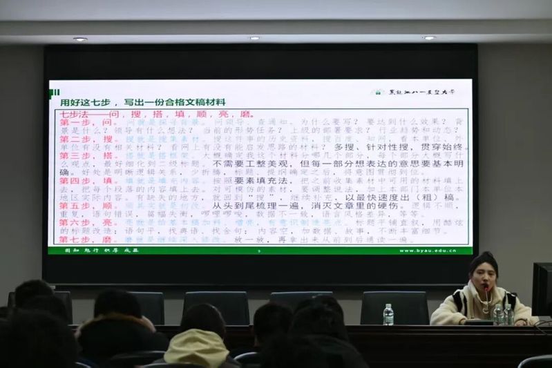 本次培訓班課程設計科學,循序漸進。培訓從基礎技能入手,石磊首先開展辦公軟件專題培訓;王小婷聚焦學生活動策劃流程并系統(tǒng)解讀《學生骨干培養(yǎng)指導手冊》;孫浩楠則圍繞“學生骨干應具備的基本素養(yǎng)及工作方法”和“文明禮儀與友好溝通”兩個專題開展指導;張欣欣則結(jié)合宣傳工作需要,進行了新聞寫作專項培訓。