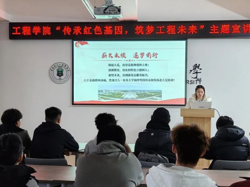 宣講現(xiàn)場,主講人圍繞黑龍江八一農(nóng)墾大學(xué)六十余載的發(fā)展征程徐徐展開。從1958年在十萬復(fù)轉(zhuǎn)軍人開發(fā)北大荒的浪潮中應(yīng)運(yùn)而生,王震將軍親任首任校長、以“紅透專深”為初心指引,到艱苦創(chuàng)業(yè)年代師生“邊建校、邊學(xué)習(xí)、邊生產(chǎn)”的拓荒歲月;從歷經(jīng)體制調(diào)整仍堅(jiān)韌前行,到2003年毅然遷校大慶開啟二次創(chuàng)業(yè)的壯闊實(shí)踐,再到如今成為服務(wù)國家鄉(xiāng)村振興與農(nóng)業(yè)現(xiàn)代化的重要高校,一個(gè)個(gè)鮮活的歷史片段、一段段感人的奮斗故事,讓在場的工程學(xué)子深刻感受到學(xué)校“困知勉行、積厚成器”的校訓(xùn)內(nèi)涵與“唯實(shí)、堅(jiān)韌、團(tuán)結(jié)、創(chuàng)新”的校風(fēng)傳承。